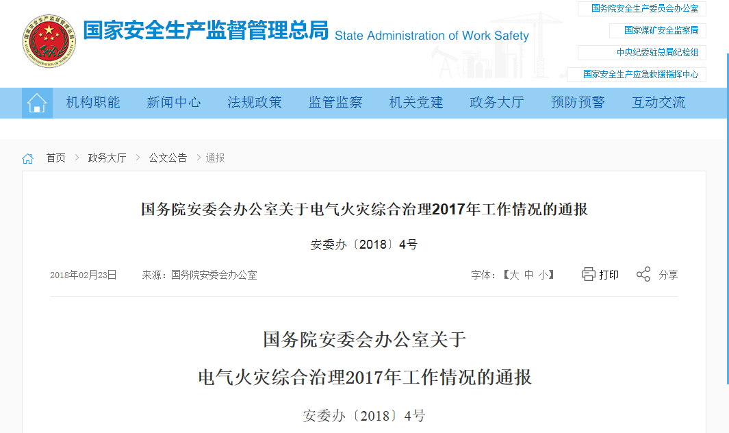 国务院安委会办公室关于 电气火灾综合治理2017年工作情况的通报