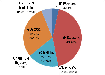 截至2017年底,全国特种设备总量达1296.52万台,比2016年底上升8.31%。其中:锅炉44.56万台、压力容器381.96万台、电梯562.7万台、起重机械223.75万台、客运索道1020条、大型游乐设施2.42万台(套)、场(厂)内机动车辆81.01万台。另有:气瓶14265万只、压力管道45.09万公里。