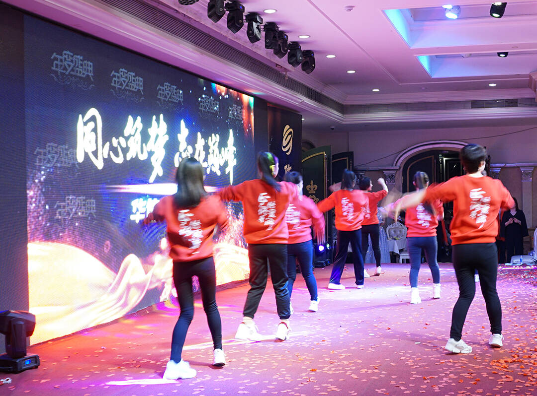 舞台上灯光闪耀,歌舞欢腾,员工们用行动来演绎、赞美华信的美好生活。